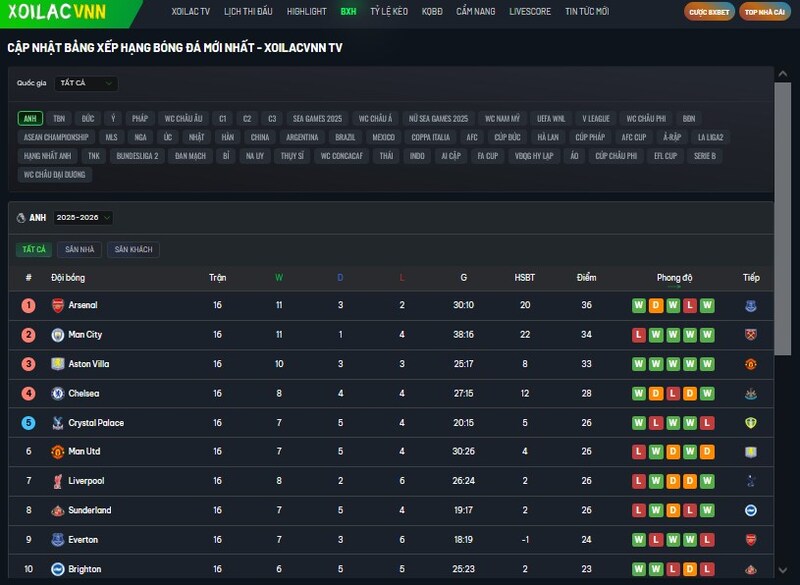 Với Xoilac Vnn thì khác. Gần như ngay sau khi trận cuối của vòng đấu khép lại, bảng xếp hạng bóng đá ngoại hạng anh đã được cập nhật: