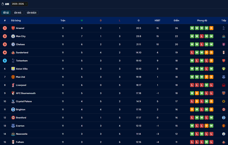 Bảng xếp hạng trên đây không chỉ đơn thuần liệt kê thứ hạng mà còn được thiết kế trực quan, dễ theo dõi với màu sắc, biểu tượng và các chỉ số trực tiếp giúp người dùng nắm bắt ngay sự thay đổi vị trí của các đội sau từng trận đấu. Hệ thống tự động cập nhật khi trận đấu kết thúc, đảm bảo người dùng luôn có thông tin mới nhất và chính xác nhất.