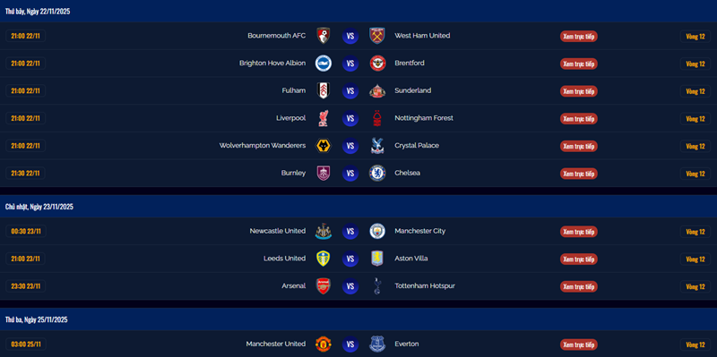 Website cập nhật lịch thi đấu của tất cả các giải đấu lớn nhỏ, từ Premier League, La Liga, Champions League, Serie A, đến V-League và giải hạng Nhất Việt Nam. Bất kỳ thay đổi nào về giờ thi đấu hay hoãn trận đều được thông báo kịp thời, đảm bảo người hâm mộ luôn nắm được thông tin mới nhất và chính xác nhất.