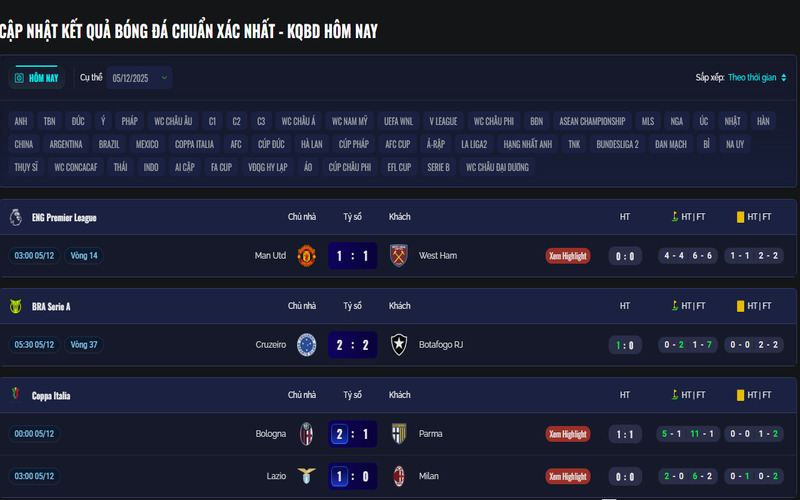 Cập nhật kqbd của mọi giải đấu